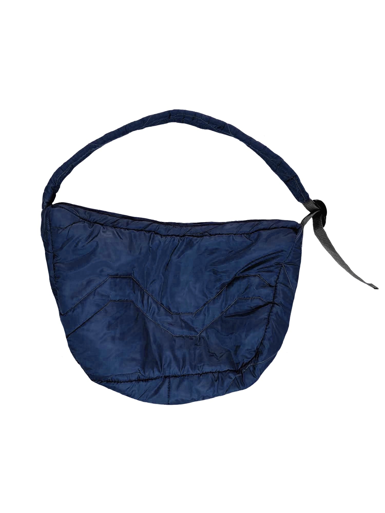 Crafted from repurposed sleeping bags, this durable and lightweight bag is designed to fit your laptop and daily essentials. It features an adjustable, padded strap for comfort, a secure zipper closure, and a sturdy lining made from reclaimed tent materials. Inside, a built-in pocket helps keep your belongings organized—perfect for work, travel, or everyday use.