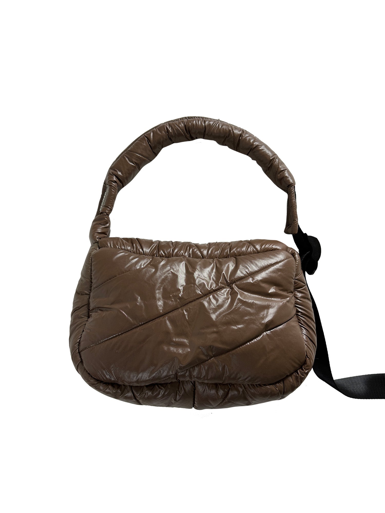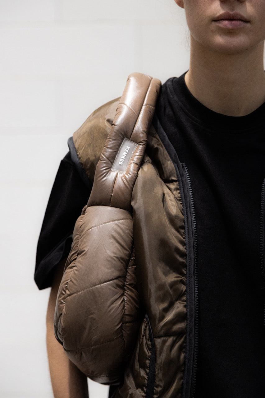 Made from repurposed sleeping bags, this unique crossbody bag combines durability with style. It features an adjustable, padded strap for comfort, a secure zipper closure, and a sturdy lining crafted from reclaimed tent materials.