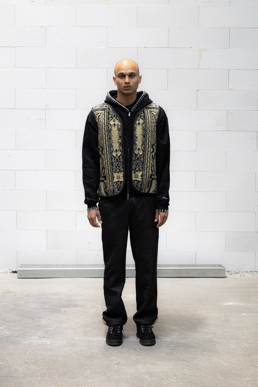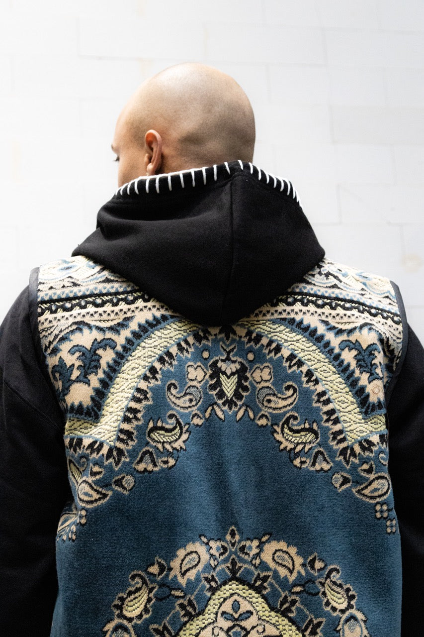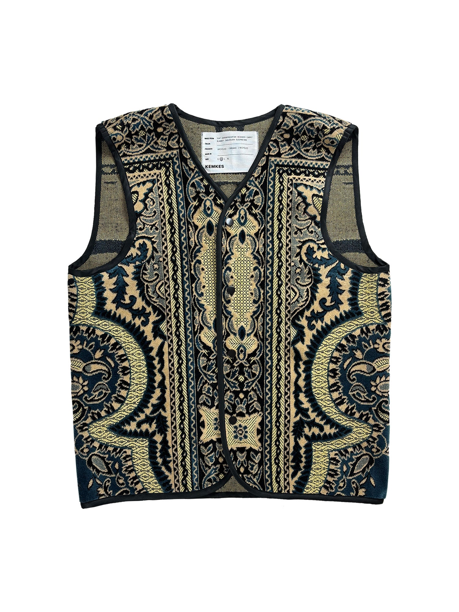 This bodywarmer is crafted from repurposed carpets It has a comfortable fit, and can be layered to create a versatile outfit.