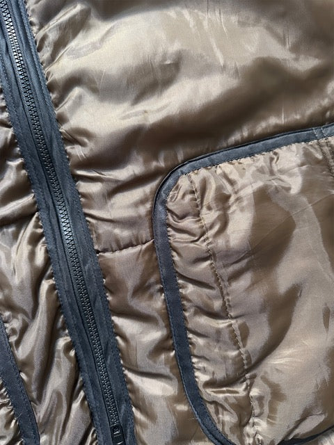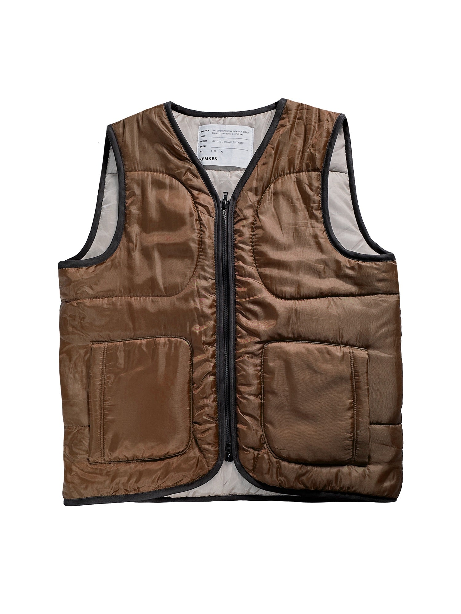 This bodywarmer is crafted from repurposed sleeping bags. It has a comfortable fit, includes two front pockets, and is completely reversible.