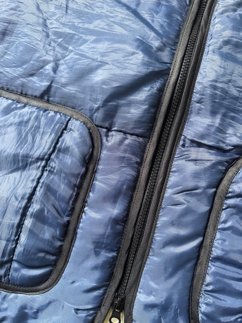 This bodywarmer is crafted from repurposed sleeping bags. It has a comfortable fit, includes two front pockets, and is completely reversible.