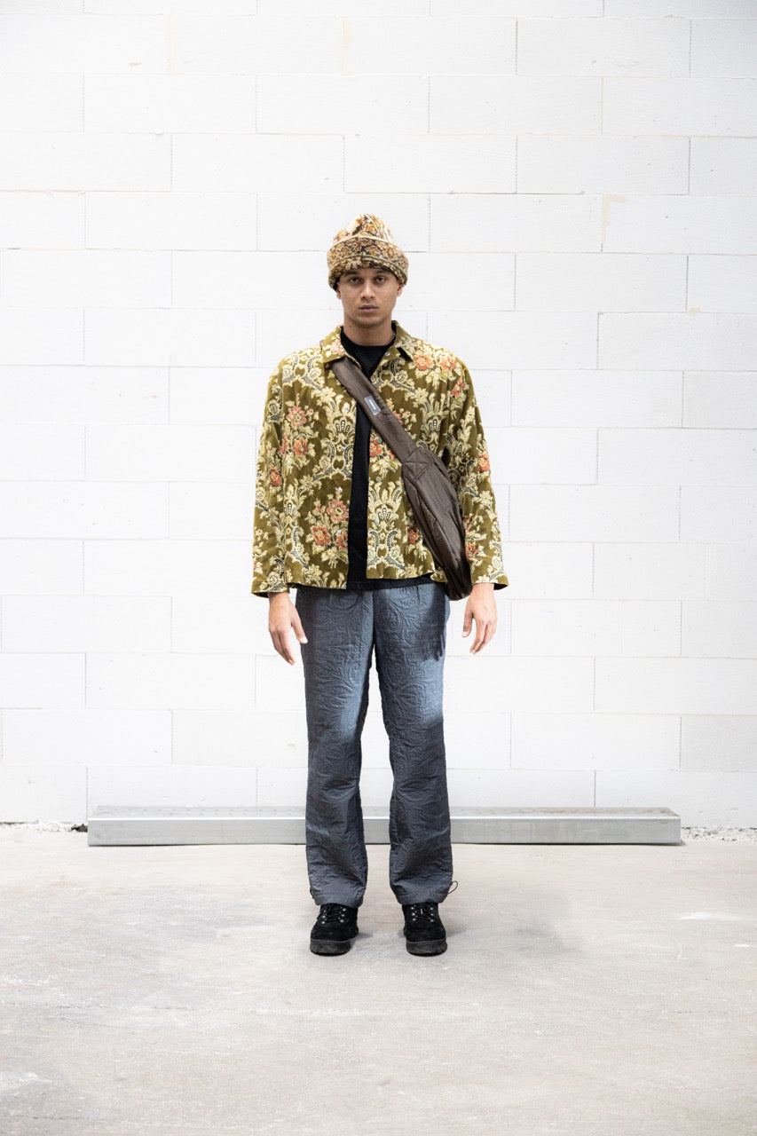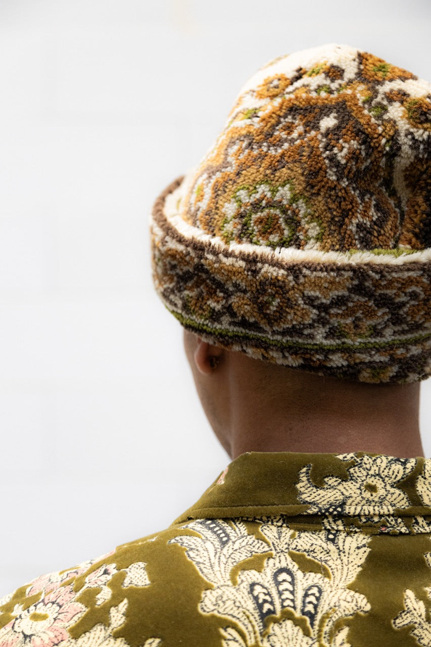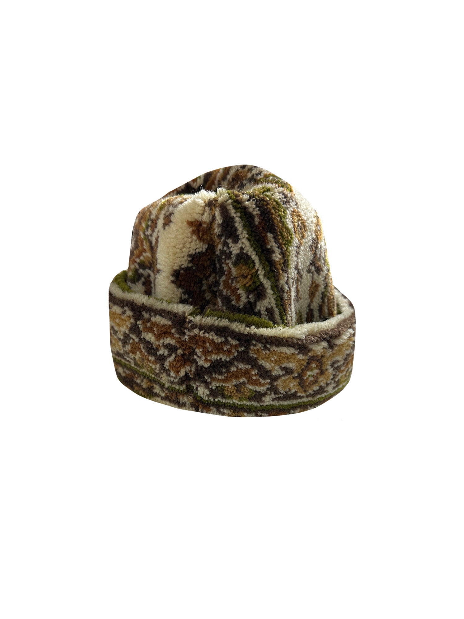 This bonnet is made from a vintage carpet. It has a folded edge and is finished withan an inside lining. Sustainably made in NL.