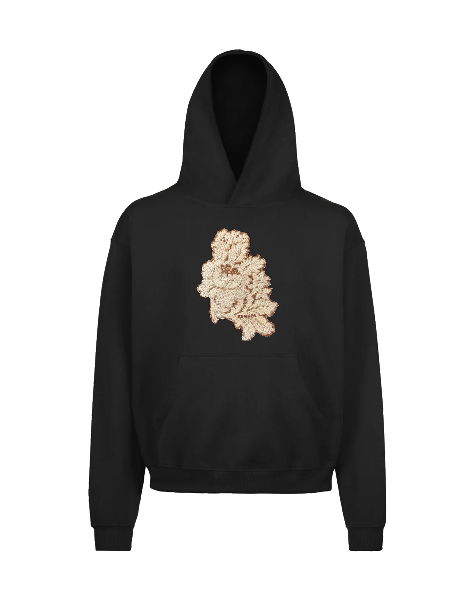 This black heavyweight hoodie offers a relaxed fit for superior comfort and durability. Featuring a classic kangaroo pocket, a patch with logo on the front, it blends premium materials with standout details. Perfect for effortless style and everyday wear.