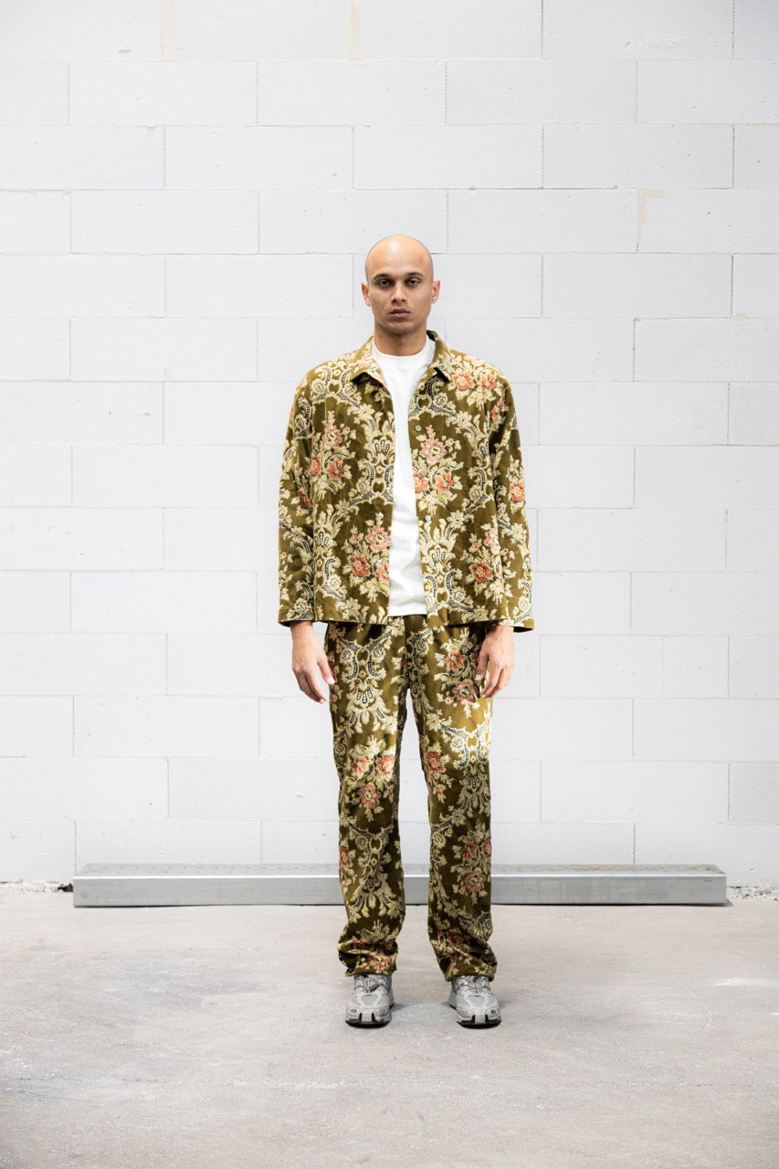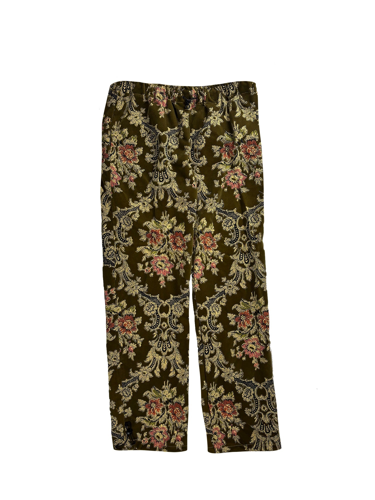 These pants are made from upcylced curtains. It has an relaxed fit and can be adjusted to size using an elasticated waistband.