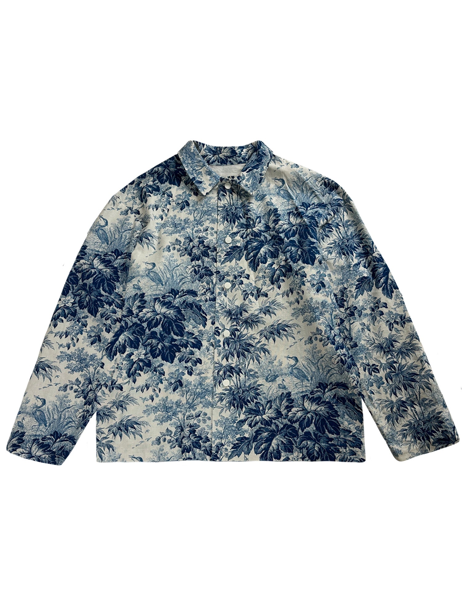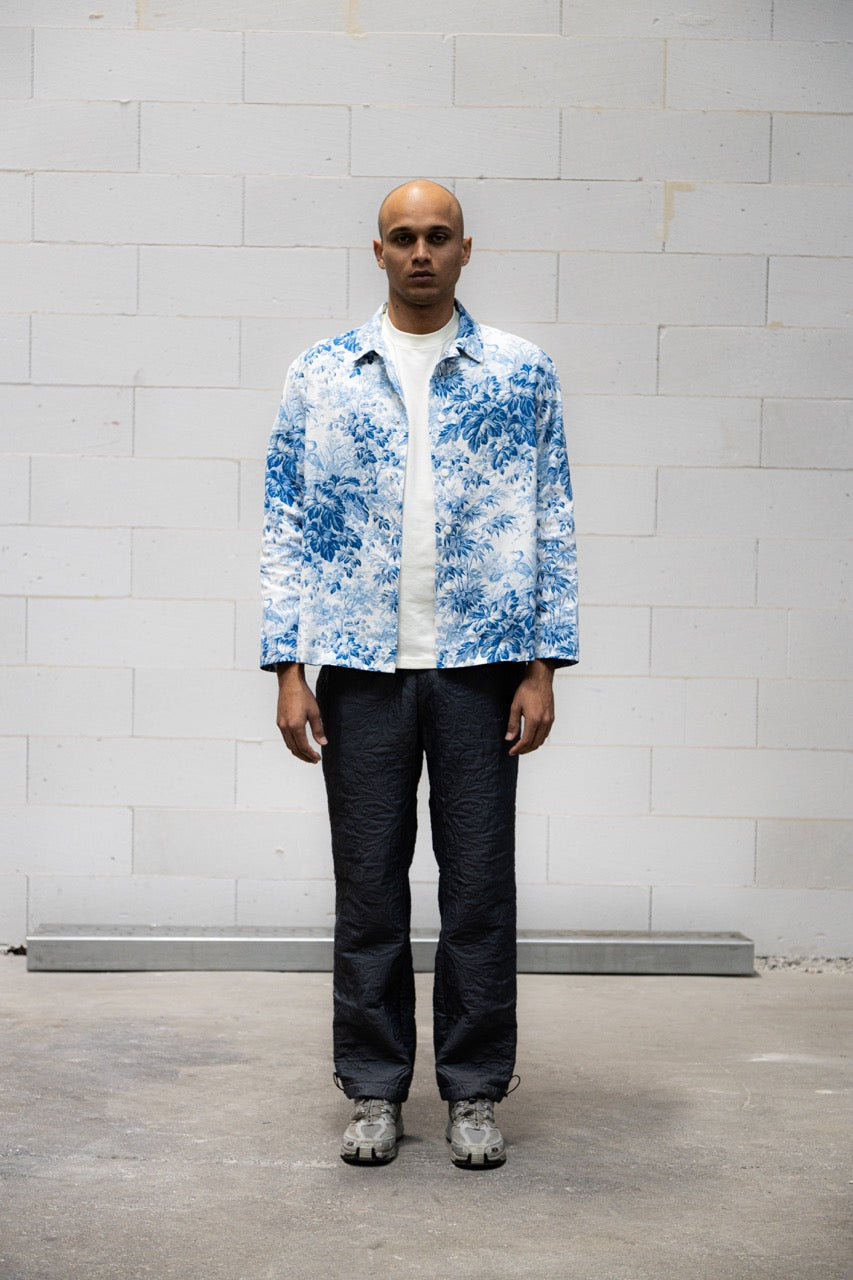 This shirt with a blue and white pattern is made from upcylced table cloth or bed linnen. It has an relaxed fit and can also worn as an overshirt.