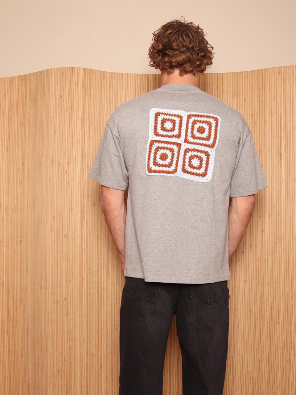 This t-shirt features a handmade crochet back and has an oversized fit. The crochet piece is handmade by Henny from Marie Marie out of light blue and brown yarns. The main material is made from 100% organic cotton and the patchwork is made out of a soft 60/40 cotton acryl blend.