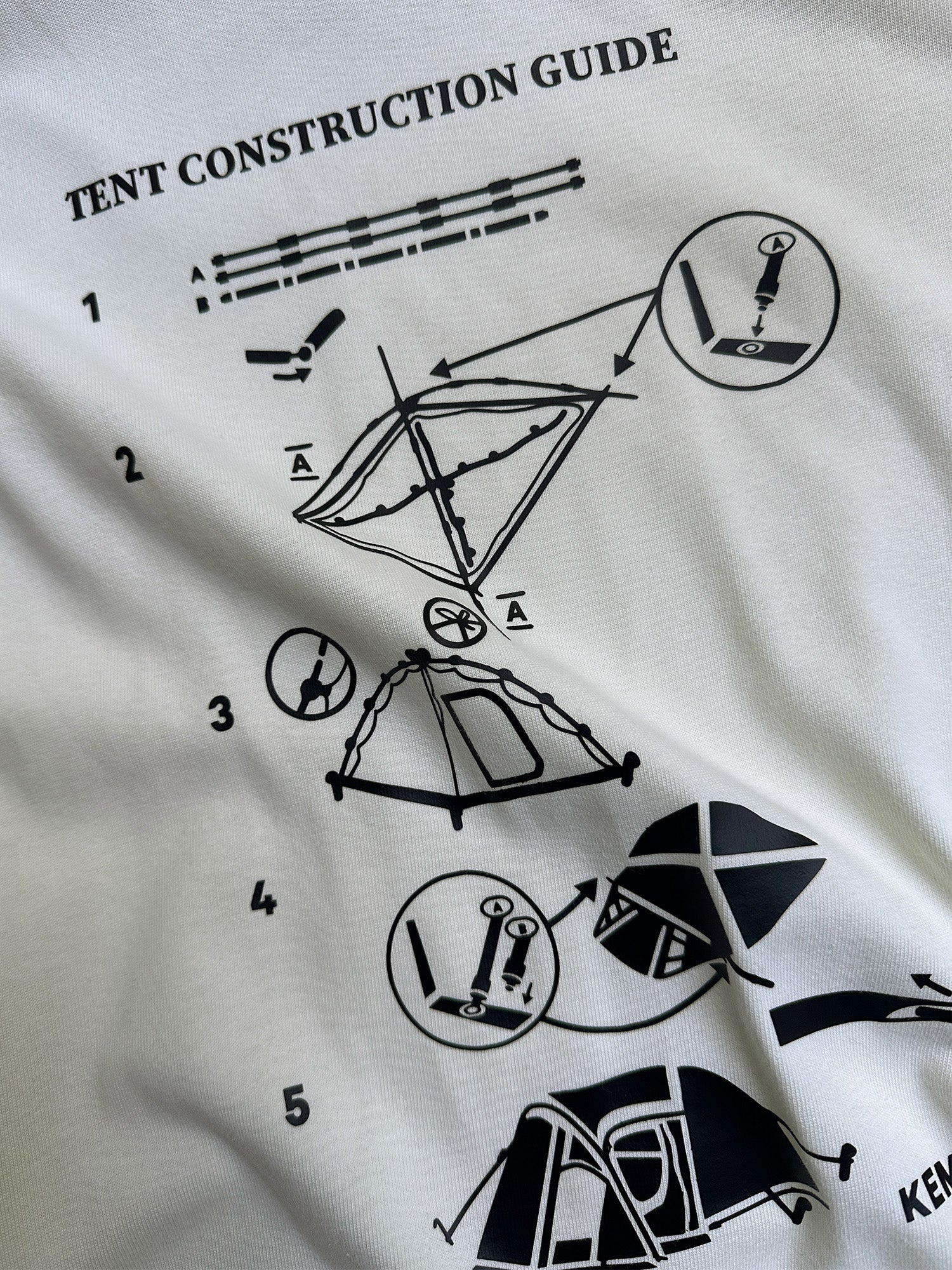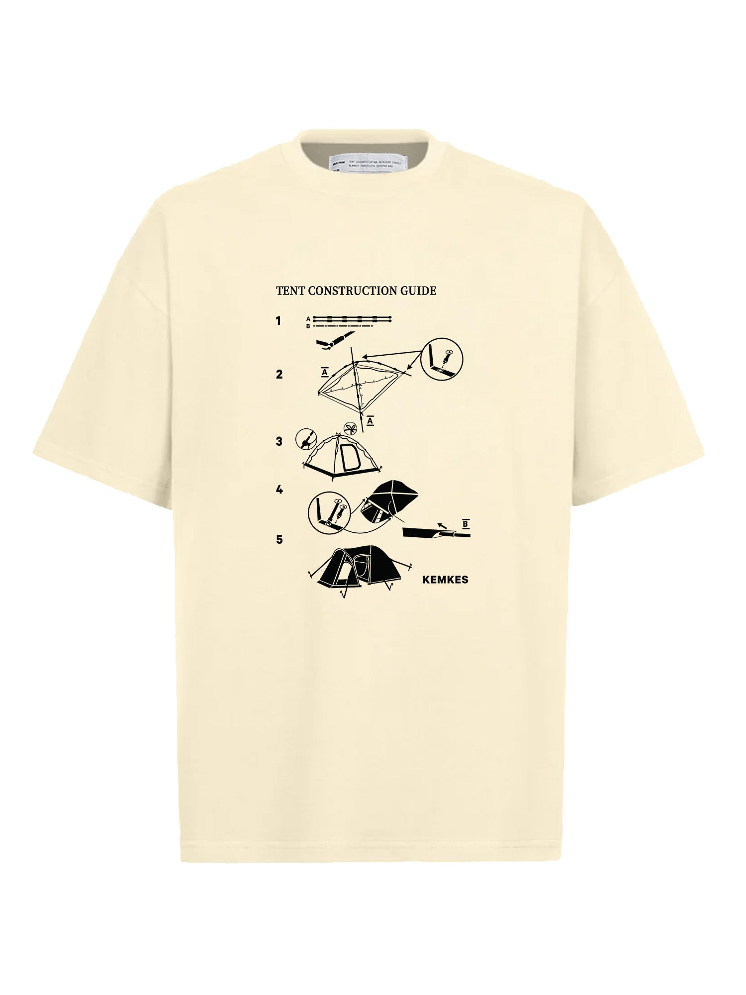 This t-shirt features a tent set-up instruction print print on the back and has a relaxed fit. The main material is made from 100% organic cotton. Great combination with the upcycled KEMKES pieces such as the upcyled tent pieces.